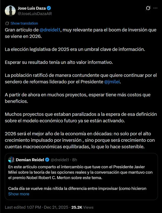 “2026 será el mejor año de la economía en décadas: no solo por el alto crecimiento impulsado por inversión, sino porque será crecimiento con cuentas macroeconómicas equilibradas, lo que lo hace sostenible”, manifestó el segundo de Caputo en sus redes sociales.