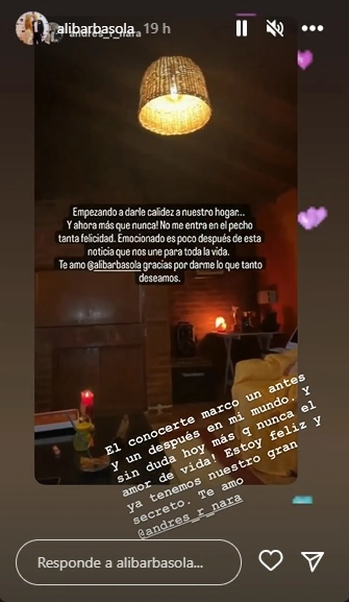 «Empezando a darle calidez a nuestro hogar… Y ahora más que nunca!!! No me entra en el pecho tanta felicidad. Emocionado es poco después de esta noticia que nos une para toda la vida. Te amo Alicia Barbasola gracias por darme lo que tanto deseamos» escribió algo enigmático el papá de Zaira y Wanda desde sus Instagram Stories.