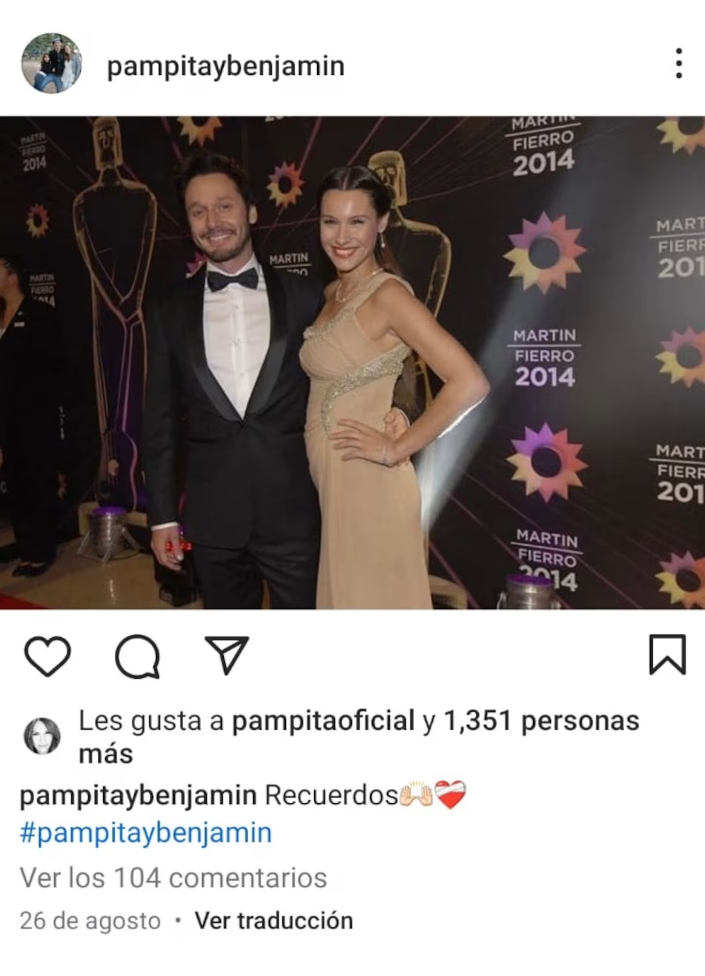 Se trata de una postal de la exlapareja en la entrega de premios Martín Fierro 2014, donde la modelo luce embarazada de Benicio Vicuña, el menor de los hijos que tuvieron. La imagen fue compartida por la cuenta de Instagram @pampitaybenjamin el 26 de agosto, cuando comenzaron a sonar las primeras versiones de distanciamiento con el político.