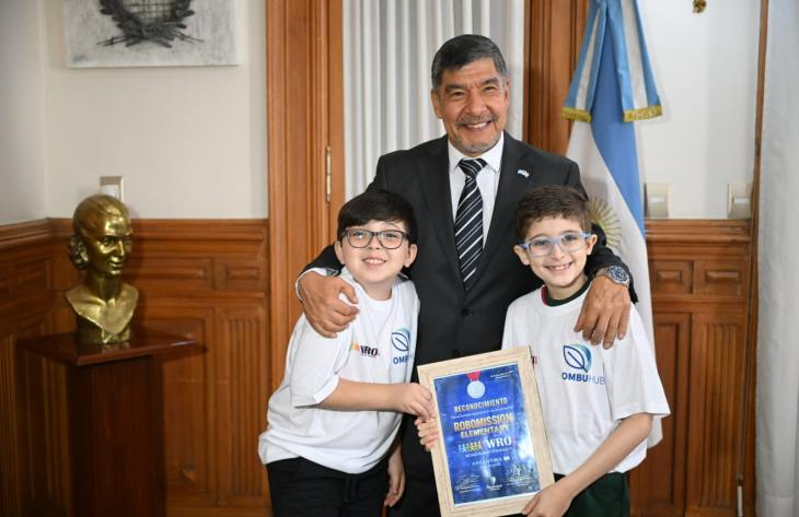 El vicegobernador a cargo del Poder Ejecutivo, Miguel Acevedo, recibió en Casa de Gobierno a los niños tucumanos Benicio Diez González y Luca Di Pauli, ganadores del segundo puesto en la competencia nacional de la World Robotic Olympics realizada en el marco de la Exposición de Economías del Conocimiento (ExpoCon) 2025. Los alumnos, pertenecientes a la Academia Digital Ombú Hub de Yerba Buena, asistieron acompañados por el director de la institución, Nicolás Caro.
