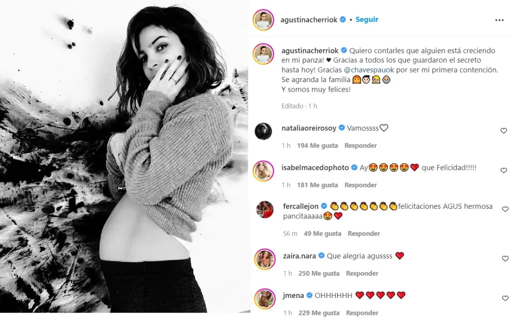 A mediados de agosto, Agustina Cherri anunció su embarazo con un posteo de Instagram en el que posó luciendo su prominente pancita.