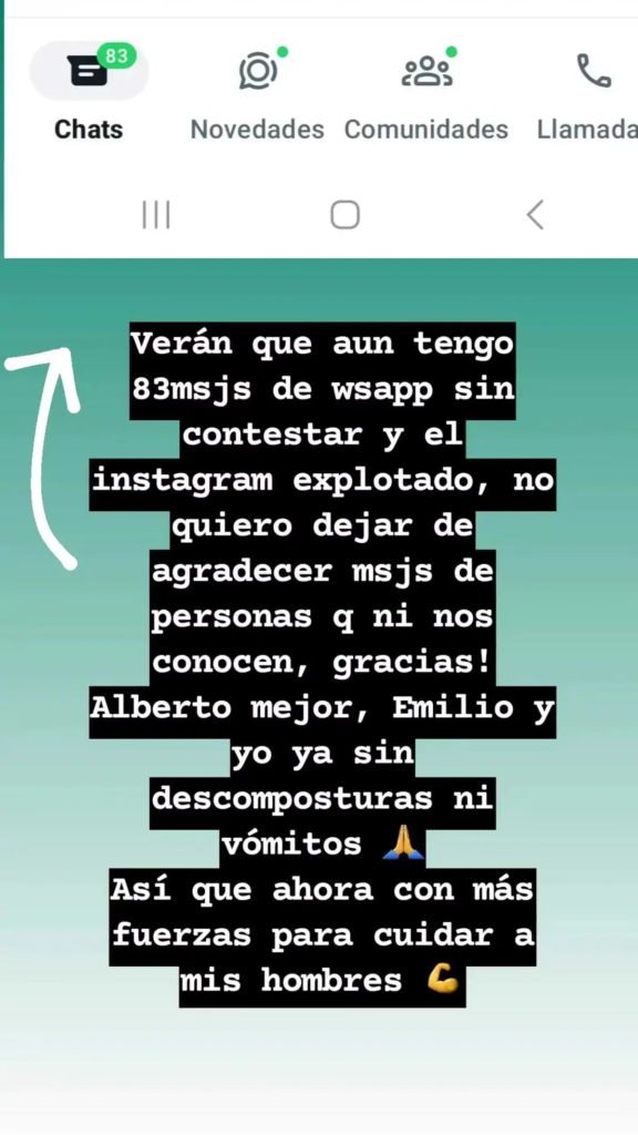 Minutos después, Estefanía subió un posteo a las redes sociales anunciado que ella y Emilio están mucho mejor, que Alberto sigue recuperándose y que tiene las redes con muchísimos mensajes por contestar.