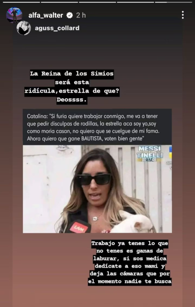 “Trabajo ya tenés. Lo que no tenés son ganas de laburar. Si sos médica dedicate a eso, mami. Y dejá las cámaras que por el momento nadie te busca”, escribió también el participante de la edición 2022 del reality.