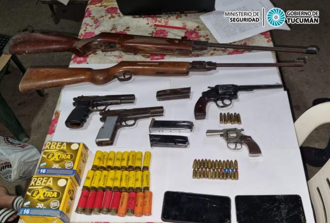 En el procedimiento, realizado en seis inmuebles ubicados en inmediaciones del cruce de calle Belisario López con pasaje 20 de junio, secuestraron un auto, 10 celulares, dos rifles de aire comprimido, dos pistolas semiautomáticas, dos revólveres de diversos calibres, 14 tarjetas, entre crédito y débito, y más de 50 cartuchos de escopeta.