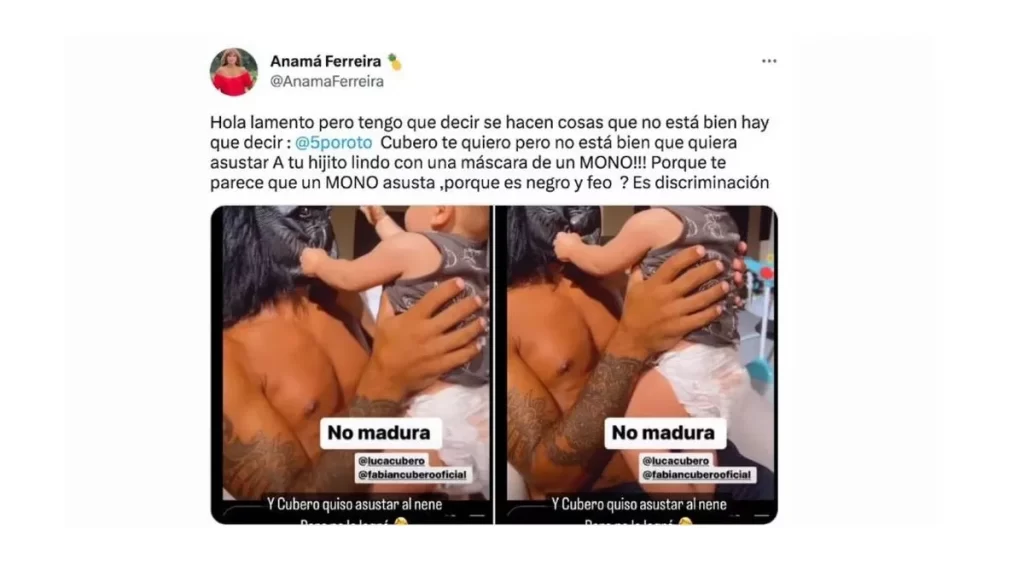 Desde Twitter, la modelo compartió esa imagen y reflexionó al respecto, mencionando directamente a Poroto: “Hola lamento pero tengo que decir cuando se hacen cosas que no está bien y entonces hay que decir: Poroto Cubero te quiero pero no está bien que quieras asustar a tu hijito lindo con una máscara de un MONO!”.