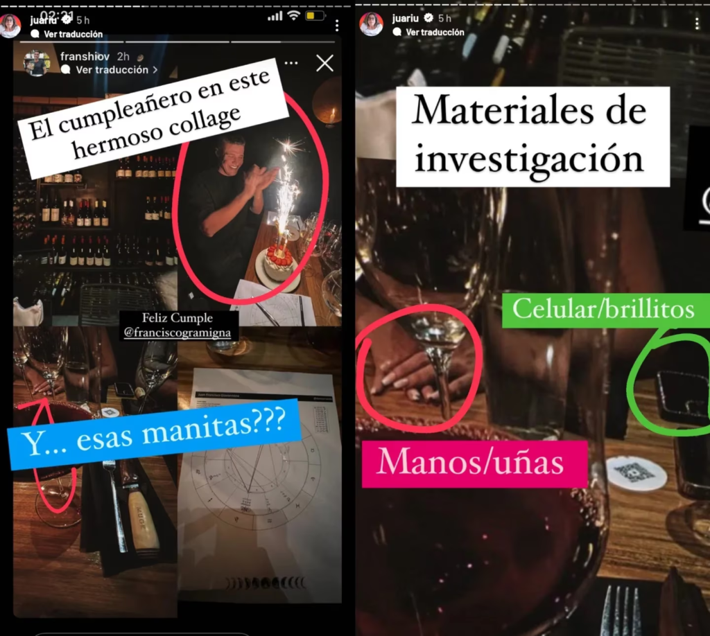 “Fran está en el cumple de un amigo, muy íntimo todo”, dijo la actual panelista de Cortá por Lozano (Telefe) en su perfil de Instagram, donde se encarga de rastrear a los famosos. En las capturas, Juariu mostró las uñas y el celular con brillitos de una de las personas invitadas que estaba sentada en la mesa, y llegó a la conclusión de que se trataba de Poggio.
