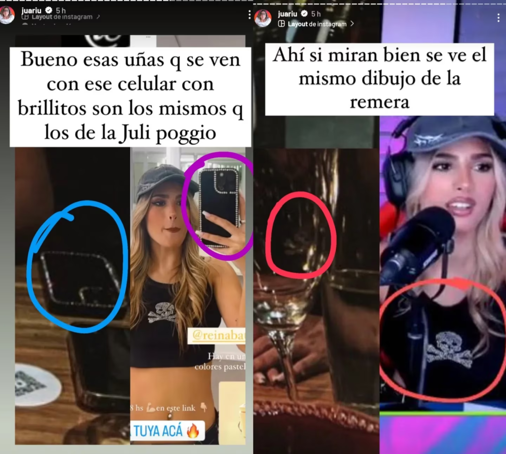 Además, en otras de sus historias, demostró que Julieta tenía puesta la misma remera que había usado en su programa de streaming, Fuera de Joda. “Las pruebas son contundentes. Ella sigue a todos los amigos de Fran, y él a las amigas de Juli”, sumó como parte de otro dato.