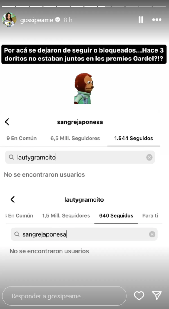 A través de sus historias de Instagram, la comunicadora mostró que ambos se dejaron de seguir en las redes. «Por acá se dejaron de seguir o bloqueados… Hace tres doritos ¿no estaban juntos en los Premios Gardel?», escribió Pochi.