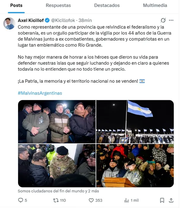 El mandatario bonaerense arribó al Monumento a los Héroes de Malvinas en Río Grande, reconocida como la Capital Nacional de la Vigilia, donde participó junto al gobernador fueguino Gustavo Melella, el intendente de Río Grande, Martín Pérez, y el gobernador de La Rioja, Ricardo Quintela, del tradicional acto.