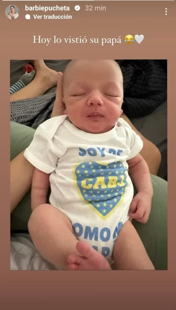 «Hoy lo vistió su papá», describió la hija de Nazarena Vélez junto a los emojis de risa y un corazón en una foto en la que se lo ve a Salvador con los ojos cerrados descansando sobre las piernas de su papá y luciendo un mini conjunto de Boca Juniors.