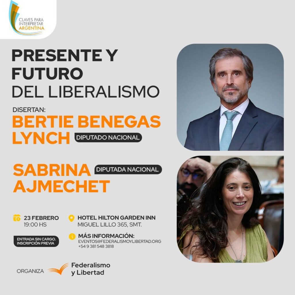 La conferencia se realizará el viernes 23 de febrero a las 19 hs en el hotel Hilton Garden Inn con la presencia de los diputados nacionales, Bertie Benegas Lynch y Sabrina Ajmechet.