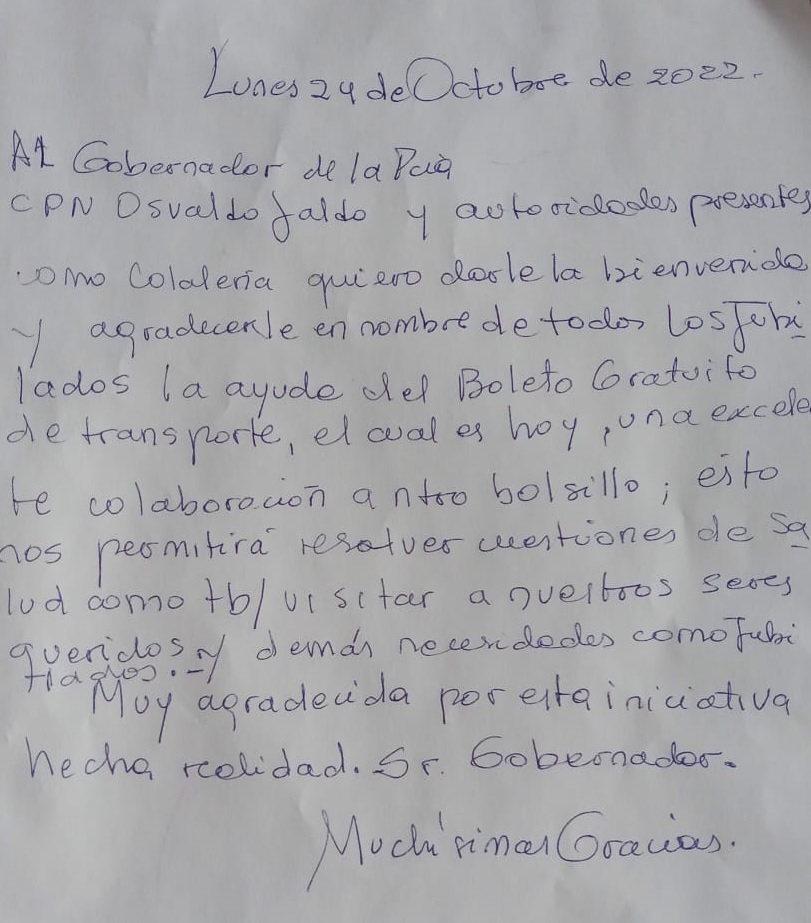 En este sentido, el mandatario agregó: «Les quiero pedir a cada uno de ustedes que los ayudemos a los abuelos a hacer el trámite para obtener el boleto gratuito, que desde ayer está disponible en la página oficial del Gobierno de Tucumán. Los abuelos deben tener los mismos derechos que hoy tienen los chicos para estudiar». El gobernador además recibió una conmovedora carta por parte de una jubilada, quien le agradeció visiblemente emocionada por la implementación del beneficio, que servirá, según contó, principalmente para atender cuestiones relacionadas a la salud y visitar seres queridos.
