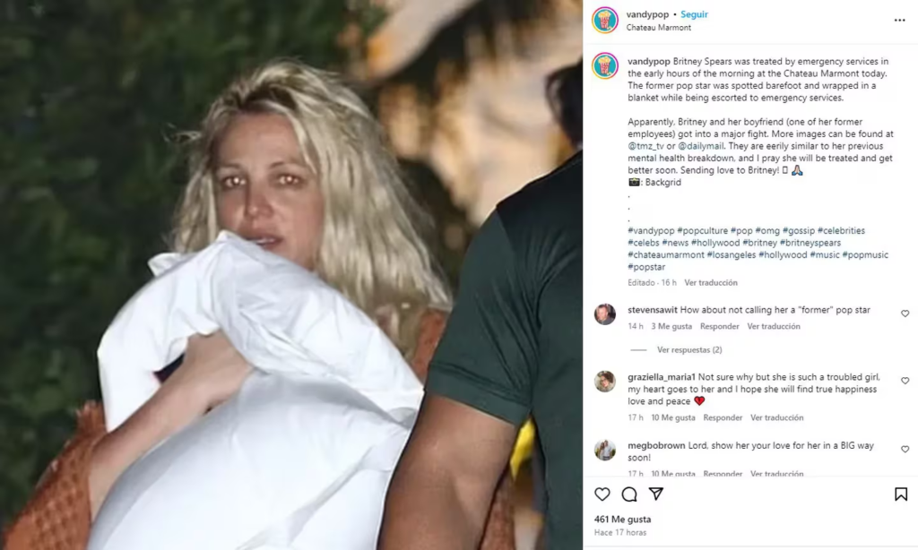 Esta semana, la cantante de “Stronger” fue vista saliendo el hotel Chateau Marmont ubicado en West Hollywood en un estado que llamó la atención de los paparazzis y sobre el que no se tiene información detallada por el momento. La situación causó muchas preguntas y especulaciones en torno a su salud, ya que se la vio tapada con una manta, sosteniendo una almohada, descalza y casi desnuda. La Princesa del pop se habría encontrado allí con su exempleado Paul Richard Soliz.