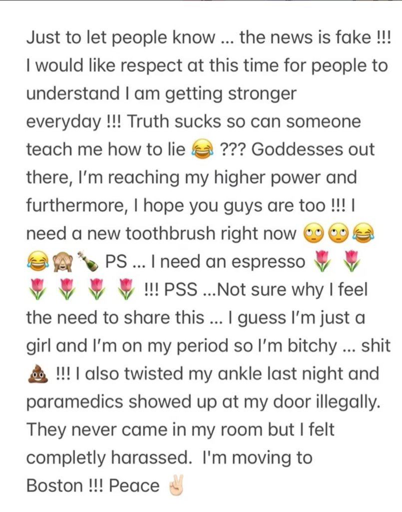 También afirmó que los médicos “aparecieron en mi puerta ilegalmente” en el hotel después de que ella se torciera el tobillo. “Nunca entraron a mi habitación, pero me sentí acosada”. “Solo para que la gente sepa… ¡¡¡la noticia es falsa!!! ¡¡¡Me gustaría que en este momento se respetara a la gente para que entendiera que cada día me hago más fuerte!!! La verdad apesta, ¿alguien puede enseñarme a mentir?”.