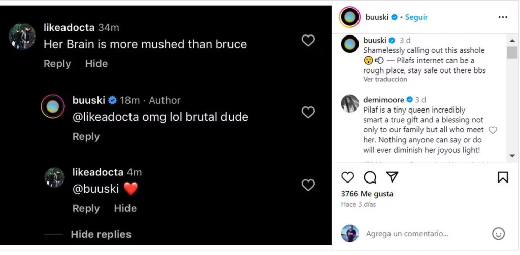 Luego, su madre y su hermana dejaron un par de replies que ampliaron la defensa de Bruce y la perra. “Si sus cerebros están aplastados, yo no quiero tenerlo sólido”, expresó Scout. “Pilaf es una pequeña reina, increíblemente inteligente y un verdadero regalo, no solo para nuestra familia, sino para todos los que la conocen. Nadie puede decir o hacer nada que pueda apagar su brillante luz”, lanzó, tajante, Demi Moore.