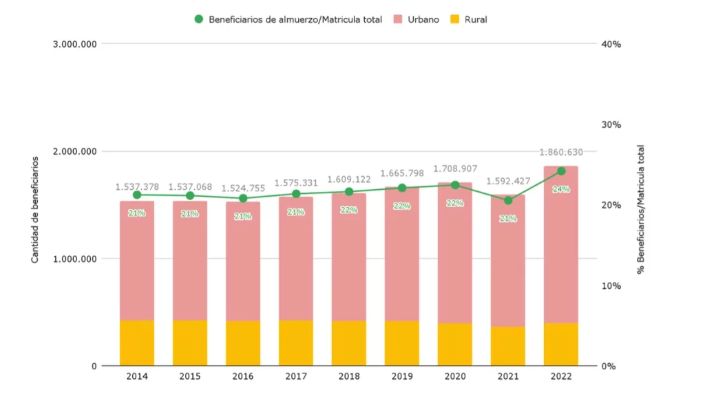 En 2014, 1 de cada 5 alumnos (20%) recibía el almuerzo en las escuelas estatales; en 2022 la cifra aumentó a casi 1 de cada 4 (24%).