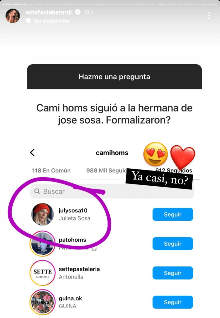 “Cami Homs empezó a seguir a la hermana de José Sosa. ¿Formalizaron?”, le preguntó un internauta a Estefanía Berardi. Ante eso, la panelista de espectáculos compartió una captura de pantalla con la interacción entre la ex de Rodrigo de Paul y la familiar de quien sería su nuevo novio. “Ya casi, ¿no?”, escribió ella.