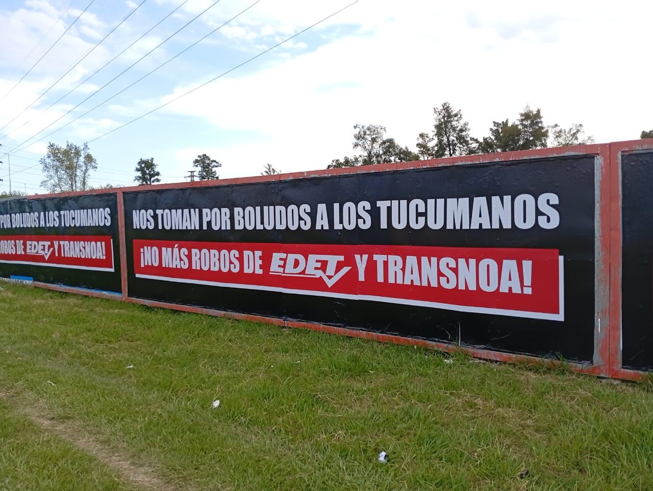 Carteles con fuertes mensajes contra la empresa de distribución de energía eléctrica, EDET SA y la transportadora eléctrica Transnoa SA, aparecieron hoy en el Acceso Norte de San Miguel de Tucumán.