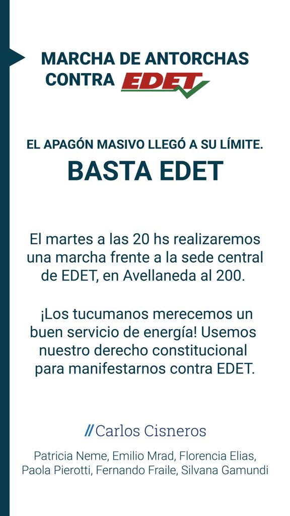 También expresó que “ahora con las altas temperaturas ya estamos viendo, como hace 30 años, los permanentes cortes de luz. Millones de usuarios se acercan a nosotros y nos comentan acerca del pésimo servicio, de las altas tarifas o de que perdieron algún electrodoméstico. Sólo un extraterrestre puede decir que EDET presta un buen servicio”, señaló Cisneros.
