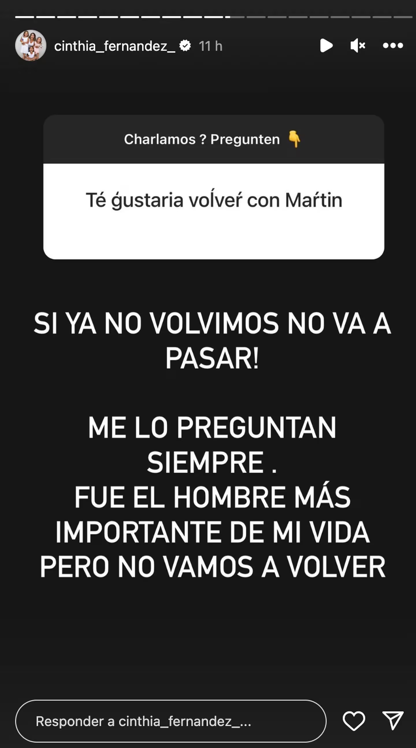Durante un juego de preguntas y respuestas que Cinthia Fernández inició en su Instagram un usuario indagó sobre el romance y le consultó: “¿Te gustaría volver con Martín?”. Sin vueltas, la mediática lanzó: “¡Si ya no volvimos no va a pasar!”.