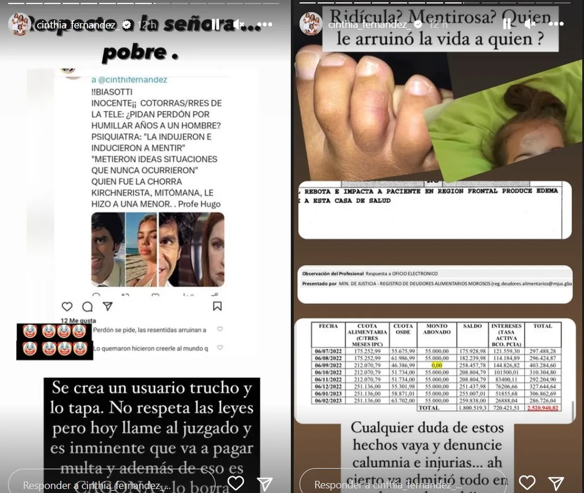 «¿Ridícula? ¿Mentirosa? ¿Quién le arruinó la vida a quién? Cualquier duda de estos hechos, vaya y denuncie calumnias e injurias. Ah, cierto que ya admitió todo en la tele, usted y su hijo», lanzó Fernández desde sus historias de Instagram mostrando uno de los mensajes que la cuestionaban.