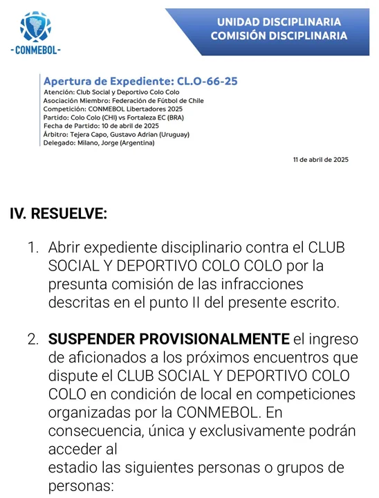Según el informe de la comisión disciplinaria de la CONMEBOL, se abrió un expediente disciplinario contra Colo Colo. La medida determinó la “suspensión provisional” del ingreso de hinchas a los próximos partidos que el elenco chileno juegue en condición de local en la Copa Libertadores de América.