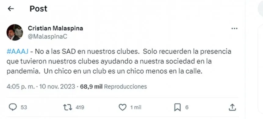 El primero en hacerlo fue Cristian Malaspina, presidente del Bicho, a través de la red social X, quien escribió: “No a las SAD, sólo recuerden la presencia que tuvieron nuestros clubes ayudando a la sociedad en la pandemia”.
