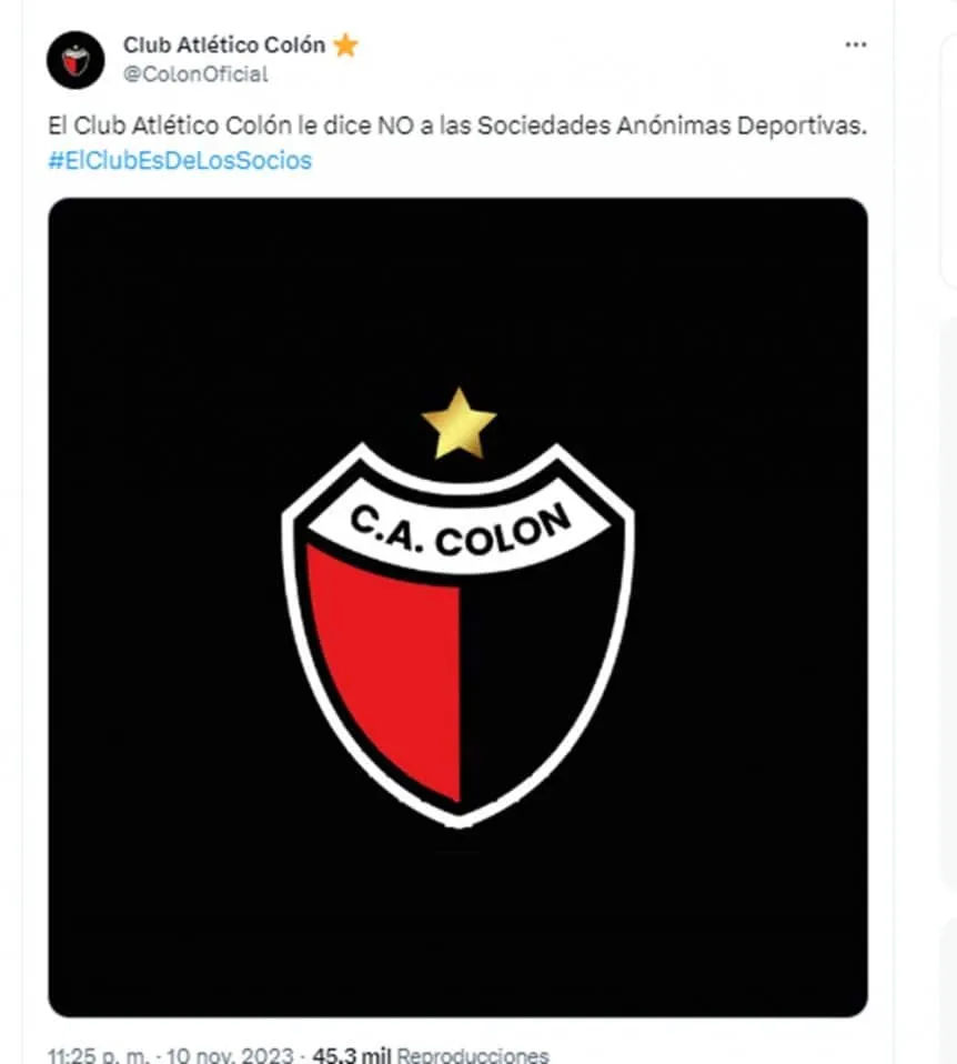 De las instituciones de la Liga Profesional, Colón fue el segundo con un mensaje en redes sociales. «El Club Atlético Colón le dice NO a las Sociedades Anónimas Deportivas. El club es de los socios», afirmaron en la cuenta oficial de X.