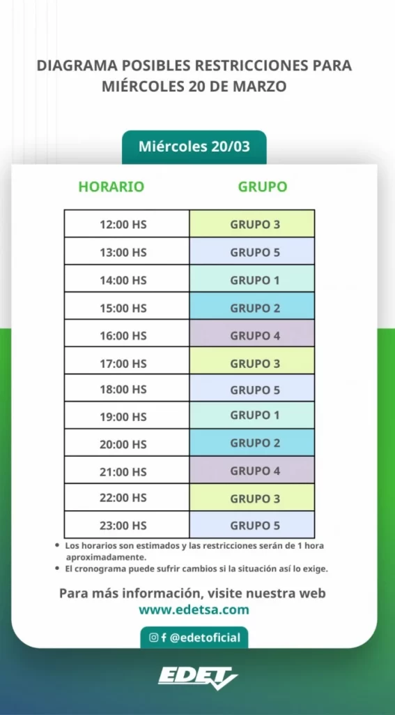 EDET publicó un comunicado donde especifica que ante la situación de público conocimiento del servicio, este miércoles 20 podrían producirse interrupciones del servicio.