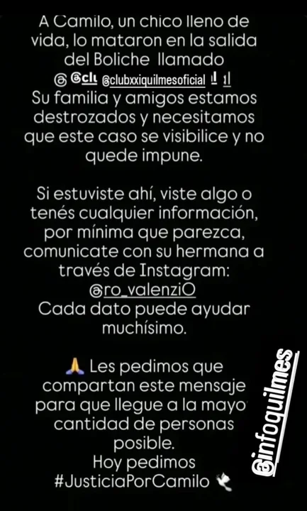 Mientras la justicia trabaja, las redes sociales se han llenado de mensajes de recuerdo y reclamos de justicia. La hermana de Camilo, en un emotivo posteo, pidió a posibles testigos que se acerquen a aportar información para que la muerte del joven «no quede impune».