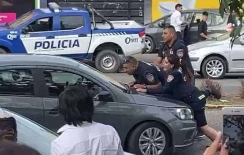 En un momento, el conductor, de 20 años, decide arrancar el vehículo y los policías se aferran al capot: «íFrená! íFrená, hijo de puta!», gritó uno de los uniformados, que terminó lesionado en una de sus piernas cuando el auto realizó una brusca frenada.