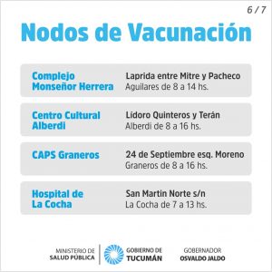 Al mismo tiempo agregó: «Los nodos habilitados en la Capital son el Autovac, la Escuela Técnica Juan XXIII, el Vacunatorio de la Familia y el Caps San Martín. Mientras que en el interior de la provincia serán todos los nodos donde ya estaban distribuidos. Estamos informando por todos los medios de difusión cuales son los lugares y horarios de atención, en estas instancias las personas pueden elegir el lugar a donde ir de acuerdo a su conveniencia, no debe ser necesariamente cercano a su residencia, tampoco hace falta sacar turno previo ni es necesaria la espera».