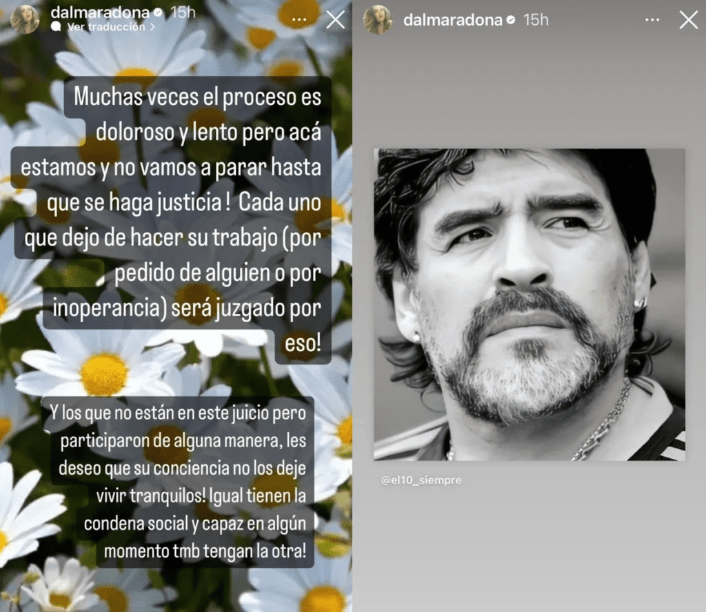 «Muchas veces el proceso es doloroso y lento pero acá estamos y no vamos a parar hasta que se haga justicia. Cada uno que dejó de hacer su trabajo (por pedido de alguien o por inoperancia) será juzgado por eso. Y los que no están en este juicio pero participaron de alguna manera, les deseo que su conciencia no los deje vivir tranquilos», escribió Dalma desde sus Instagram Stories con una imagen de fondo de margaritas y sumó luego una foto del astro futbolístico.