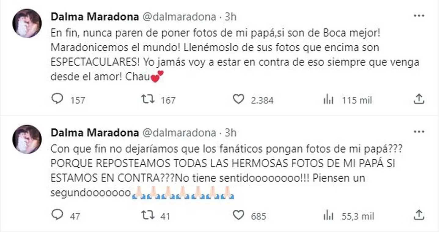 Minutos más tarde, cerró el tema con otro tajante tuit: “En fin, nunca paren de poner fotos de mi papá, si son de Boca mejor! ¡Maradonicemos el mundo! ¡Llenémoslo de sus fotos que encima son espectaculares! ¡Yo jamás voy a estar en contra de eso, siempre que venga desde el amor! Chau”.