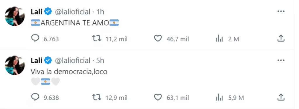 Los mensajes de la diva pop no pasaron desapercibidos en las redes sociales. Muchos de sus fans celebraron sus palabras, mientras que algunos libertarios la cuestionaron con dureza. “Para todos los que decía que Lali vaya preparando las valijas”, “¿No te da vergüenza?”, “Ponés en valor nuestra cultura y compromiso con la democracia” y “Te amamos reina”, fueron algunos de los comentarios que coparon la red de la X.
