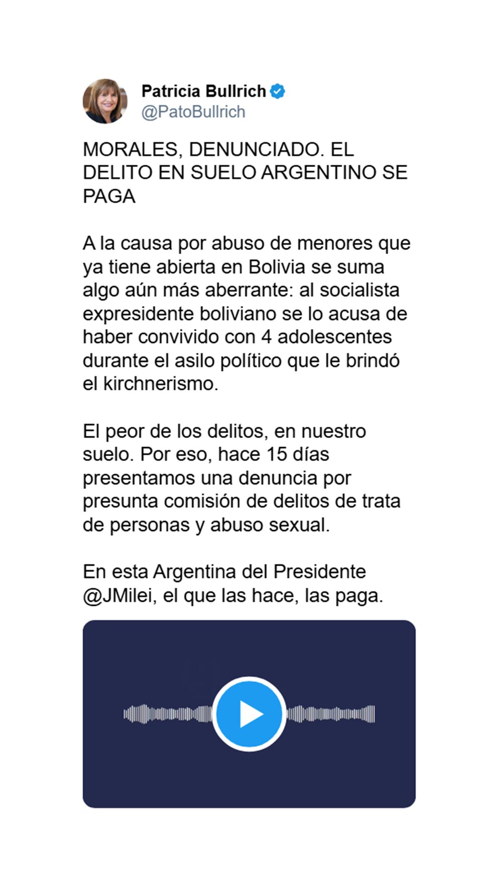 “A la causa por abuso de menores que ya tiene abierta en Bolivia se suma algo aún más aberrante: al socialista expresidente boliviano se lo acusa de haber convivido con 4 adolescentes durante el asilo político que le brindó el kirchnerismo. El peor de los delitos, en nuestro suelo”, señaló Bullrich, en su cuenta personal de X. Y remató con la consigna de que la Argentina del presidente Javier Milei, “el que las hace, las paga”.