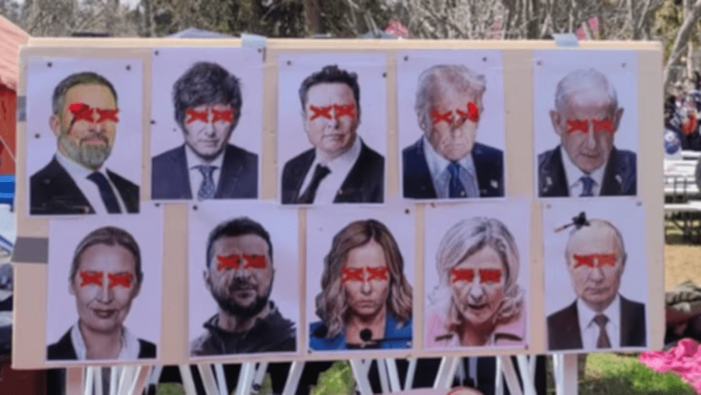 Las imágenes llevaban los rostros tachados y allí también se incluyeron las figuras de Giorgia Meloni, primera ministra italia; Santiago Abascal, líder de Vox; Alice Weidel, líder de Alternativa por Alemania; Marine le Pen, líder francesa de Agrupación Nacional; y Elon Musk.
