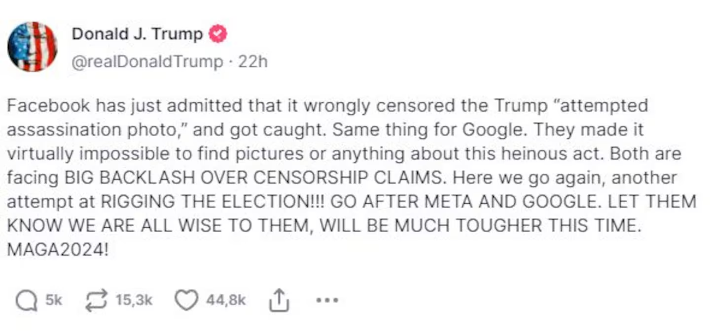 “Facebook acaba de admitir que censuró erróneamente la foto del intento de asesinato (…) Lo mismo con Google. Hicieron que fuera prácticamente imposible encontrar imágenes o cualquier cosa sobre este acto atroz. Ambos enfrentan las reacciones por las acusaciones de censura”, escribió en su cuenta personal, @realDonaldTrump.