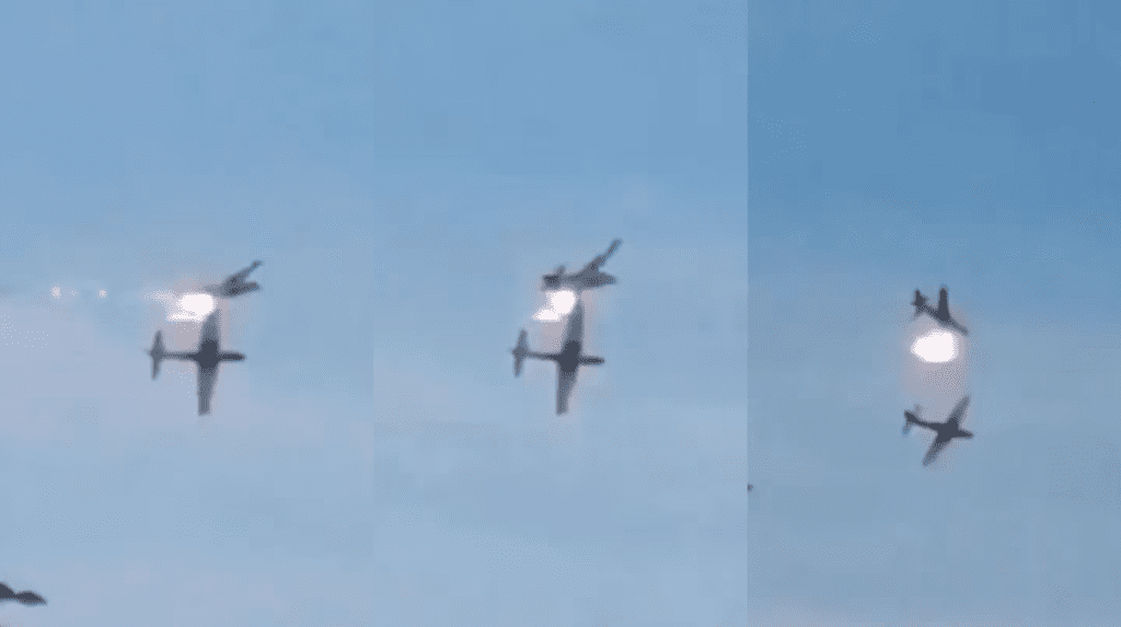 Las imágenes del accidente se viralizaron rápidamente en las redes sociales y en ellas se puede ver como uno de los dos aviones impactó al otro por debajo, y ambos descendieron a toda velocidad, envueltos en una enorme llama. “Se cayó un avión”, repitió varias veces la mujer que grababa el momento.