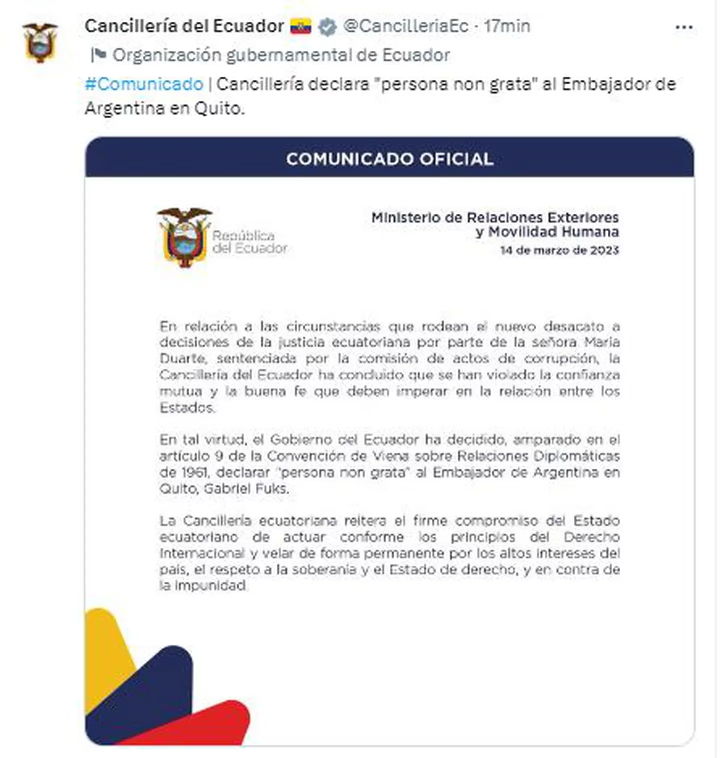 La nota afirmó que “en tal virtud, el Gobierno de Ecuador ha decidido , amparados en el artículo 9 de la Convención de Viena, sobre Relaciones Diplomáticas de 1961, declarar “persona no grata” al embajador argentino en Quito, Gabriel Fuks”.