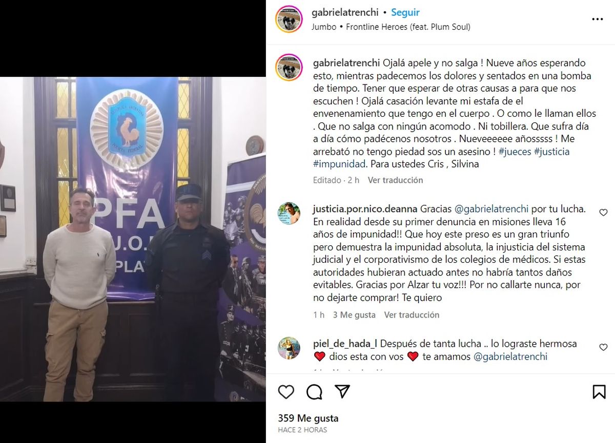 «Que sufra día a día cómo padecemos nosotros. Nueveeeeee añosssss! Me arrebató no tengo piedad sos un asesino! #jueces #justicia #impunidad. Para ustedes Cris, Silvina», finalizó Gabriela Trenchi.