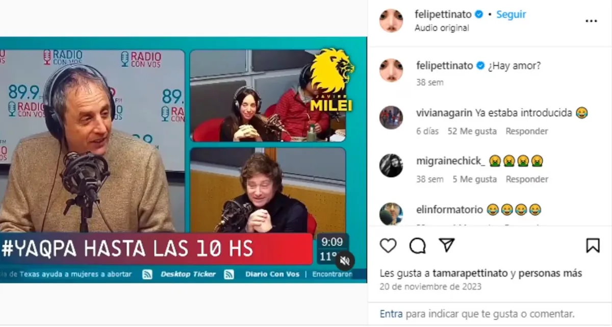 En aquel momento, Felipe había compartido en su cuenta de Instagram la parte de la entrevista en la que Tamara dialoga con Javier Milei. Pero en la descripción de su posteo, se lee una muy sutil pregunta: «¿Hay amor?».