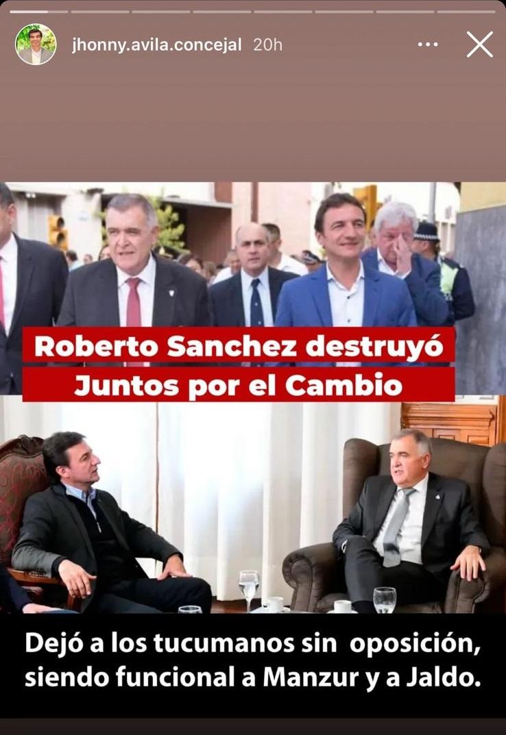 El concejal alfarista Rodolfo «Jhonny» Ávila publicó un duro mensaje en sus redes sociales, en medio de la tensa interna que atraviesa la coalición opositora en Tucumán: «Roberto Sánchez destruyó Juntos por el Cambio», arremetió el edil del PJS.
