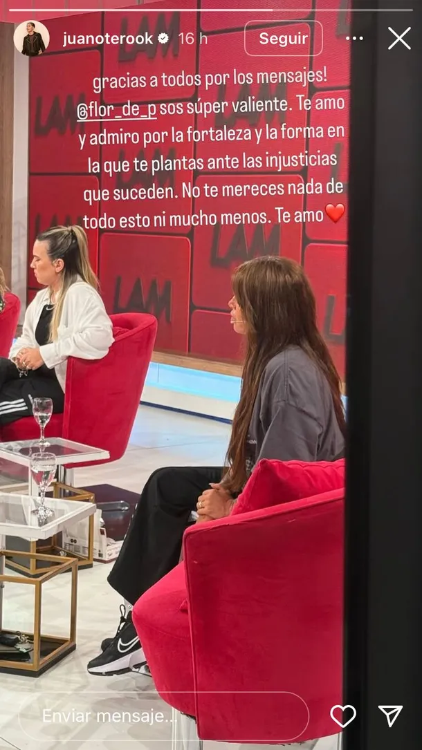 En tanto, en Instagram, el joven publicó la misma imagen con un mensaje similar: «¡Gracias a todos por los mensajes! @flor_de_p sos súper valiente. Te amo y admiro por la fortaleza y la forma en la que te plantás ante las injusticias que suceden. No te merecés nada de todo esto ni mucho menos. Te amo», junto a un emoji de corazón.