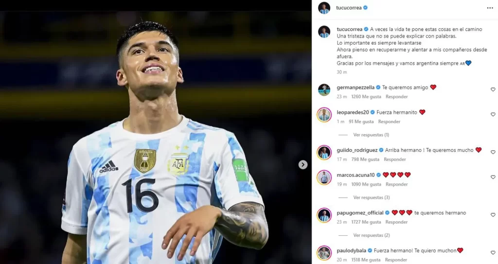 Joaquín Correa fue desafectado de la Selección argentina tras sufrir una lesión en la rodilla izquierda y horas después de abandonar la concentración en Qatar publicó un mensaje en Instagram: “Es una tristeza que no se puede explicar con palabras”.