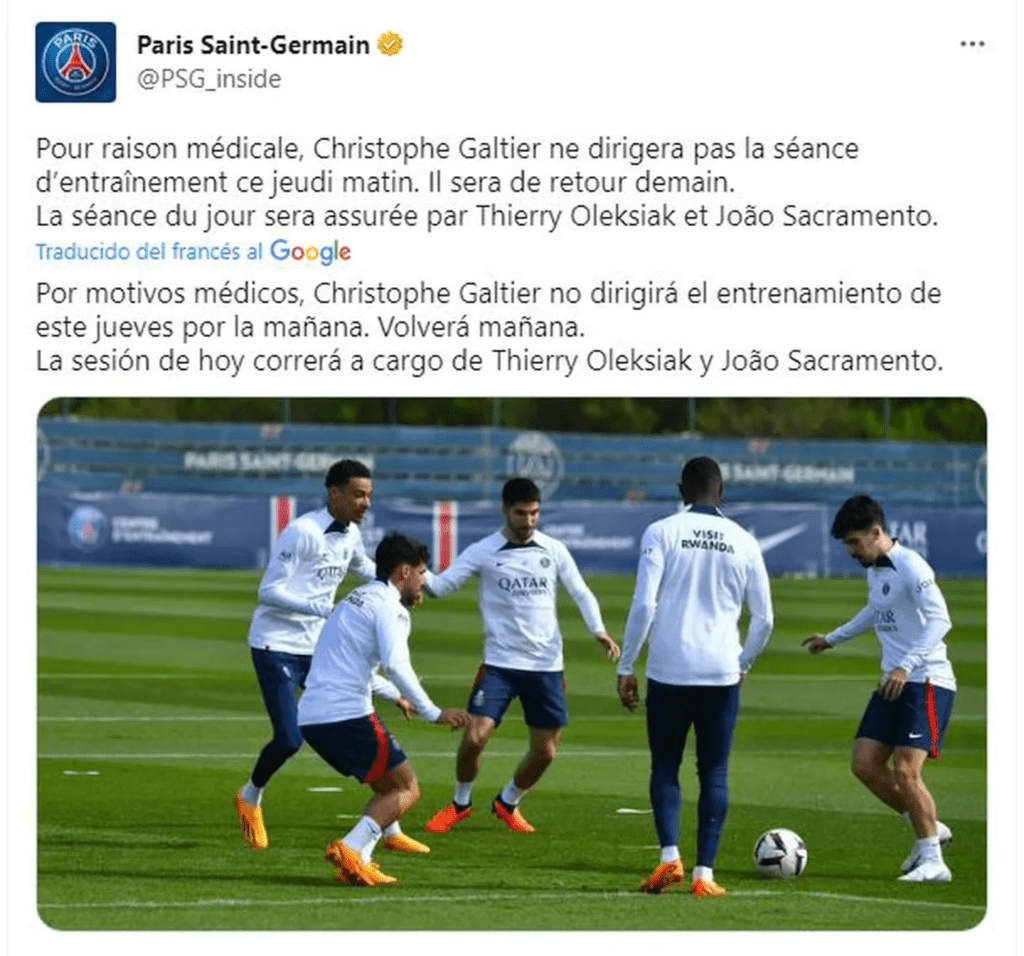 “Por motivos médicos, Christophe Galtier no dirigirá el entrenamiento de este jueves por la mañana. Volverá mañana. La sesión de hoy correrá a cargo de Thierry Oleksiak y João Sacramento”, publicó el club en sus redes sociales.