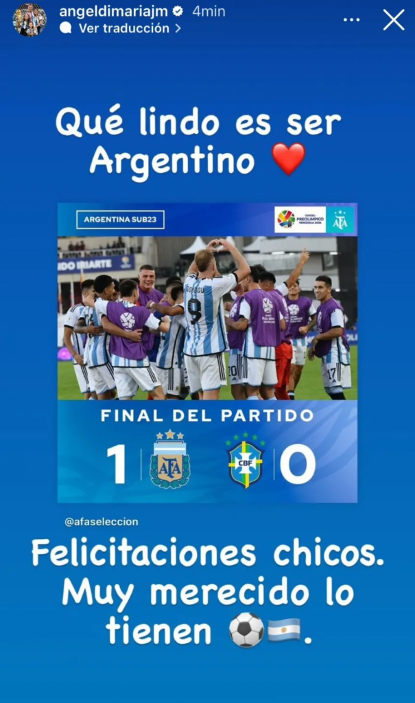 Ángel Di María no se quedó afuera de la ola de congratulaciones al plantel que logró su objetivo en Venezuela. «Muy merecido lo tienen», valoró el Fideo.