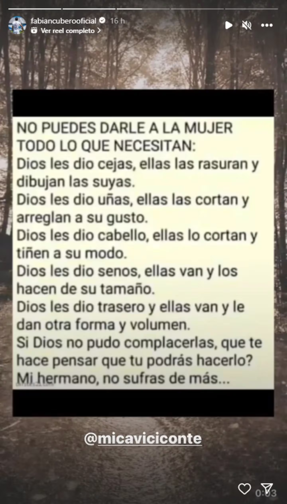 A través de su Instagram, Fabián Cubero compartió una reflexión sobre las mujeres y no dudó en etiquetar a Mica Viciconte en la historia. “No puedes darle a la mujer todo lo que necesitan”, lee el mensaje.