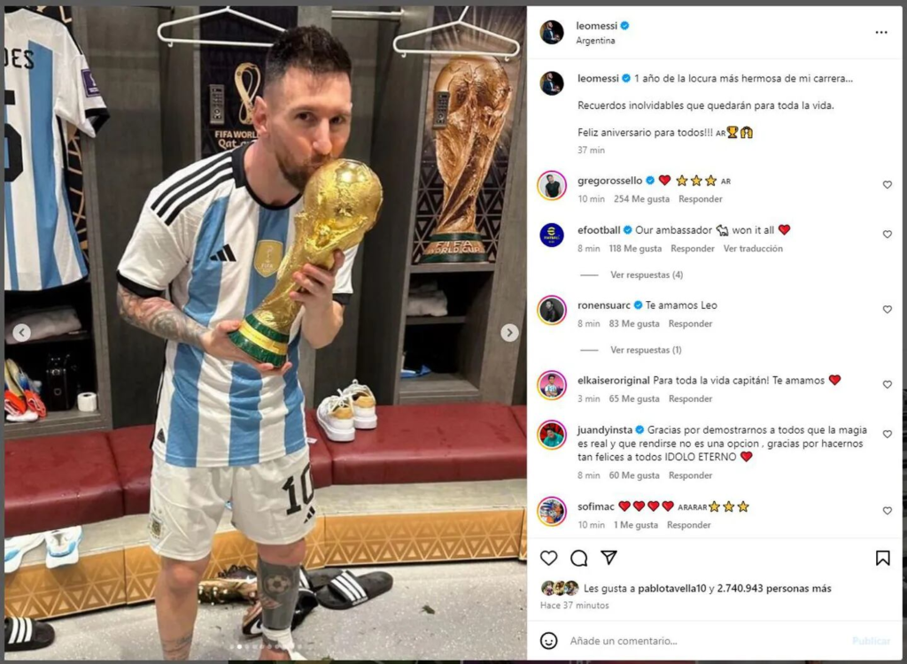 “Nunca olvidaremos aquel 18 de diciembre donde vibraron todos los corazones celestes y blancos. Gracias eternas por acompañarnos y alentarnos en cada partido, sin alguno de todos ellos esto no hubiera sido posible. Feliz aniversario campeones”, cerró el rosarino que acompañó sus palabras con un video que recorre los mejores momentos de Qatar 2022.