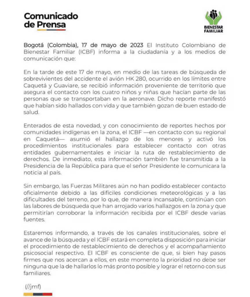 El martes las autoridades hallaron la aeronave en una zona rural del caserío Palma Rosa, que integra el municipio de Solano, en Caquetá. Allí encontraron los cuerpos sin vida de los tres adultos que viajaban en el aparato, pero no hallaron rastro alguno del bebé de 11 meses y de los tres niños de 13, 9 y 4 años de edad que estaban entre los pasajeros.